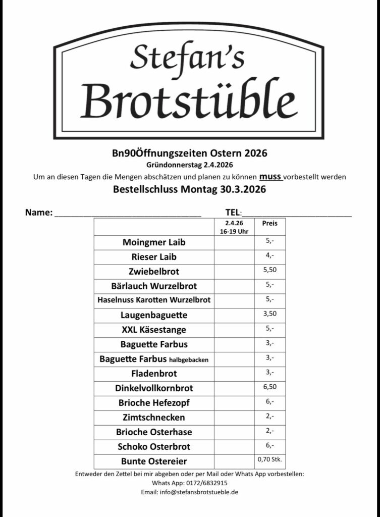 Außerdem backe ich auch dieses Jahr gerne eure Osterschinken im Brotteig ein. Diese könnt ihr dann entweder am Freitag 27.3.2026 oder am Dienstag 31.3.2026 zwischen 16-18 Uhr bei mir abgeben.